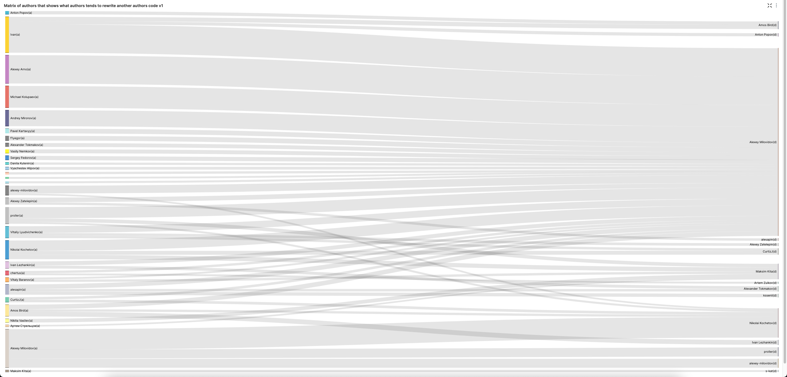 Matrix of authors that shows what authors tends to rewrite another authors code