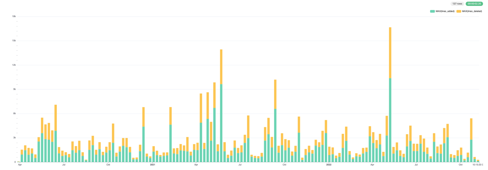 This doesn't capture the notion of a "re-write" however, where a large portion of the file changes in any commit. This requires a more complex query. If we consider a rewrite to be when over 50% of the file are deleted, and 50% added. You can adjust the query to your own interpretation of what constitutes this.